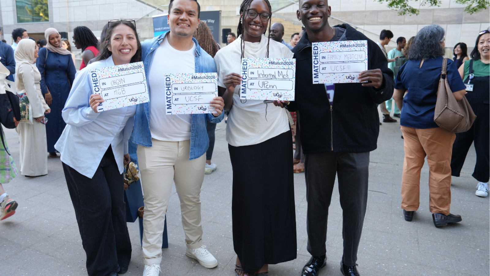 On the morning of March 20, 2026, 166 graduating UCSF medical students gathered under clear blue skies at Koret Quad on the Mission Bay campus and at the UCSF Fresno campus in Fresno to mark one of the defining moments of their medical education: Match Day. Surrounded by family, friends, mentors, and faculty, they awaited the long-anticipated reveal of where they will spend the next several years in residency—taking their next steps as physicians.